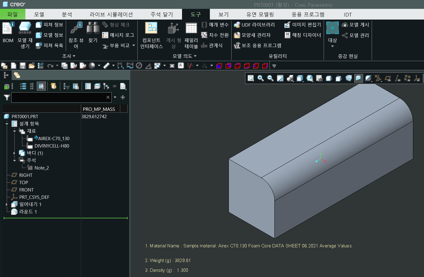 - 재질의 밀도 값은 "KS" 규격을로 입력 되어 있고, 재질이 지정 되면 자동으로 모델의 단위로 변환 됩니다