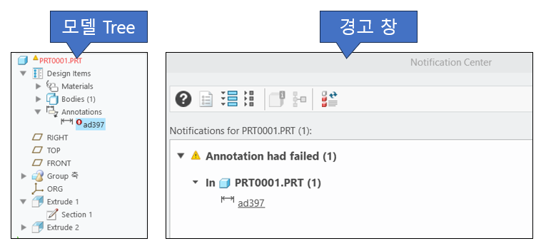오류가 발생하는 3D Dimension은 모델 Tree와 경고창에 표시됩니다. 오류가 발생한 3D Dimension은 재배치 또는 삭제가 가능 합니다.