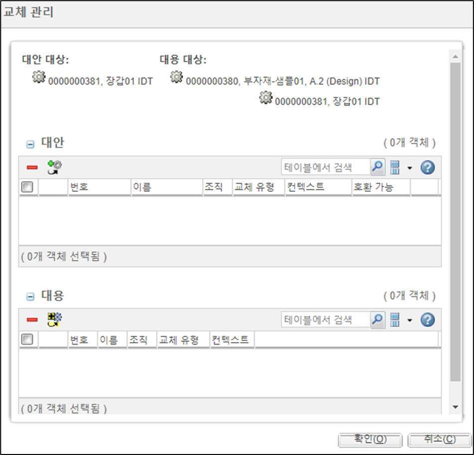 교체 관리 창을 사용하여 부품 목록의 항목에 두 가지 유형의 교체 관계를 지정할 수 있습니다.