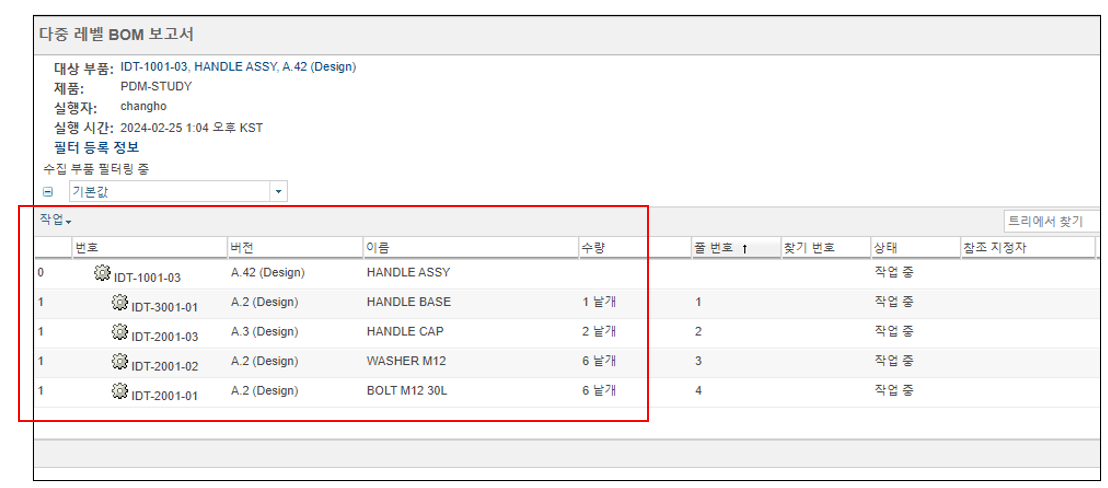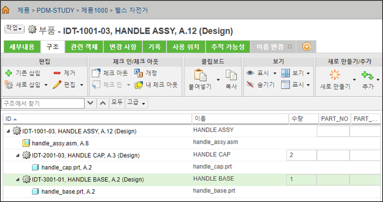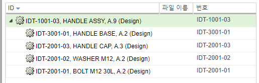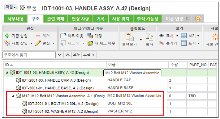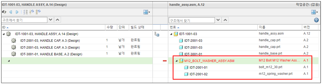 WTPart 구조와 Creo 구조를 비교 합니다. "볼트"와 "와셔" 부품이 없는것이 확인 되었습니다. 수동으로 해당 부품을 추가 합니다. 수량도 수동으로 입력 합니다.