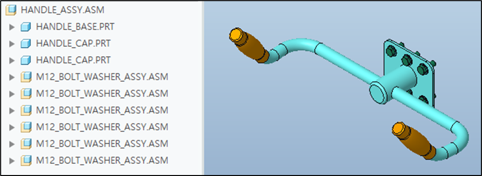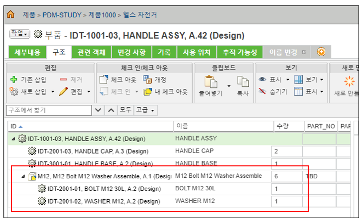 위 구조는 WTPart 구조와 Creo 모델 구조가 다릅니다. "M12_BOLT_WASHER_ASSY.asm" 와 연결 되는 WTPart는 없습니다.