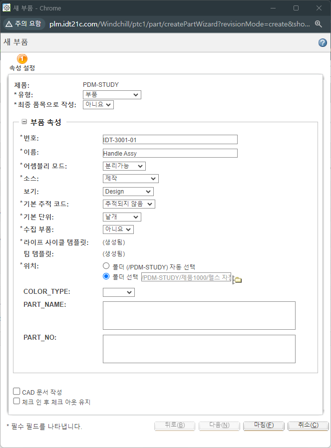 WTPart를 만들면서 바로 Creo 파일을 만들수 있습니다. 하지만 여기서는 WTPart를 먼저 만들고, Creo 모델을 다른 설계자가 만들었다고 가정 하겠습니다. Creo 모델의 "번호"는 WTPart의 "번호"와 동일 합니다