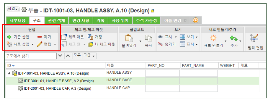 편집 기능을 이용하여 BOM 구조를 만듭니다. 수량은 기본으로 "1"개로 정의 합니다