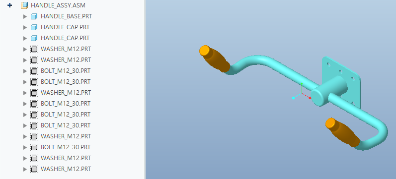 Creo 모델에서 라이브러리 "볼트" 및 "와셔"를 조립 합니다. 조립의 편의성(?)을 고려하여, 어셈블 파일을 만들고, 하위 부품으로 "볼트", "와셔" 부품을 조립 합니다. 이것은 "M12_BOLT_WASHER_ASSY.asm" 입니다. E-BOM에서는 사용하지 않습니다.