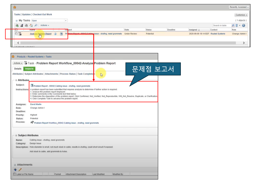 3.영향 받는 객체 선택 : 문제 보고서와 연관된 부품, 문서, 기타 변경 가능 객체 등 영향 받는 로컬 객체와 외부 객체를 식별합니다.