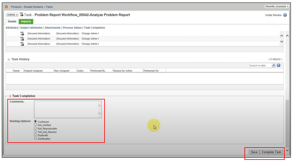 변경 관리자 I은 추가 정보를 입력하고 임무 페이지의 맨 아래에 있는 라우팅 옵션 중 하나를 선택합니다. 문제 보고서가 거부되면 프로세스가 종료됩니다. 문제 보고서가 수락되면 변경 요청 단계로 워크플로가 진행됩니다.