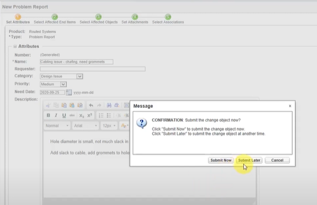 제품 문제는 대체로 부품 또는 문서와 같은 객체의 정보 페이지에서 문제 보고서가 작성되면서 캡처됩니다. 문제 보고서 작성자는 카테고리 및 우선 순위와 같은 기타 속성 정보와 함께 문제의 이름 및 설명을 제공합니다. 또한 영향 받는 최종 품목과 추가적으로 영향 받는 객체 및 첨부를 입력합니다.