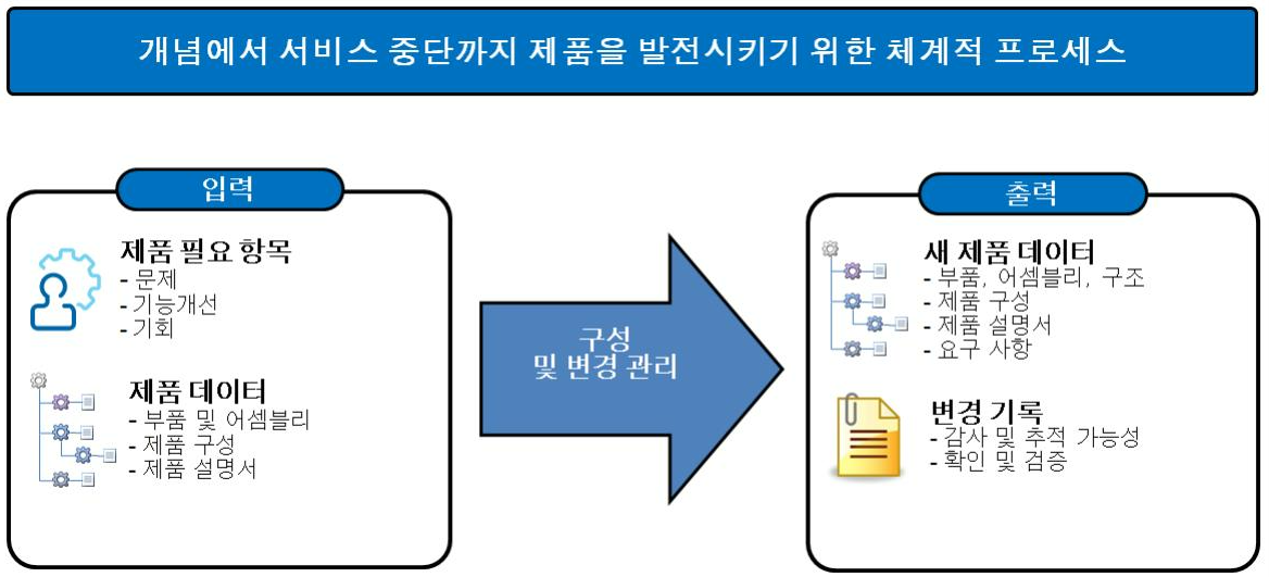 제품의 변경 사항을 체계적으로 관리하고 제어하는 기능입니다. 이를 통해 제품의 품질, 안전성, 성능을 유지하고 개발 프로세스를 효율적으로 관리할 수 있습니다.