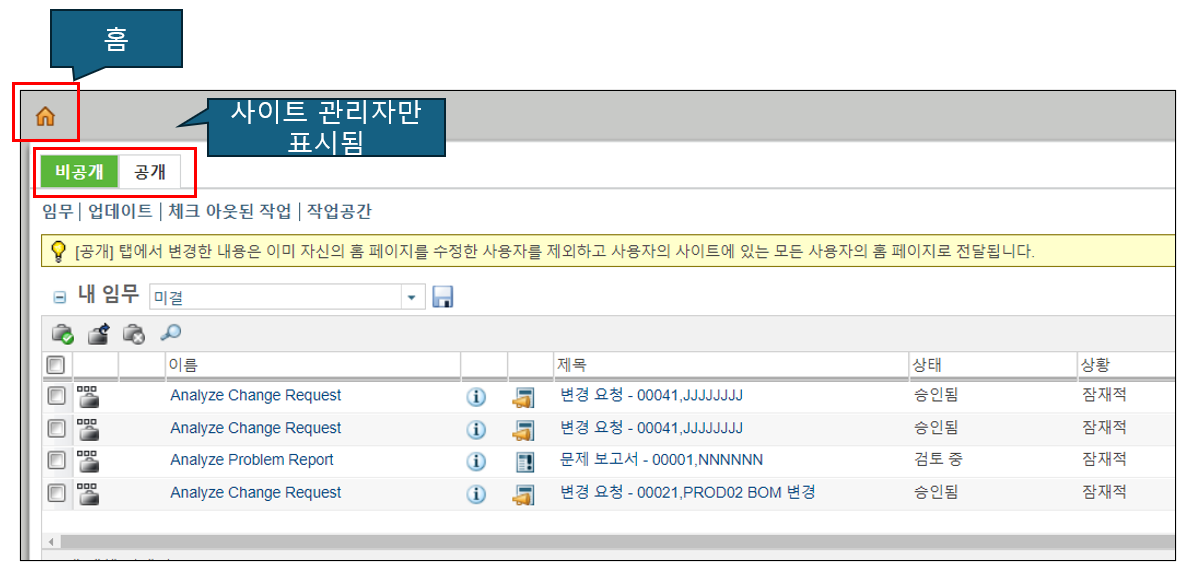 홈 이미지는 작업, 체크아웃한 작업, 가입(subscriptions) 등 귀하에게 특정한 정보에 대한 액세스를 제공합니다. Windchill 페이지의 왼쪽 상단 모서리에 있는 이미지를 클릭하여 홈 이미지 페이지로 돌아갑니다.