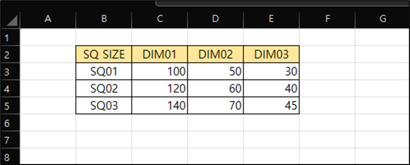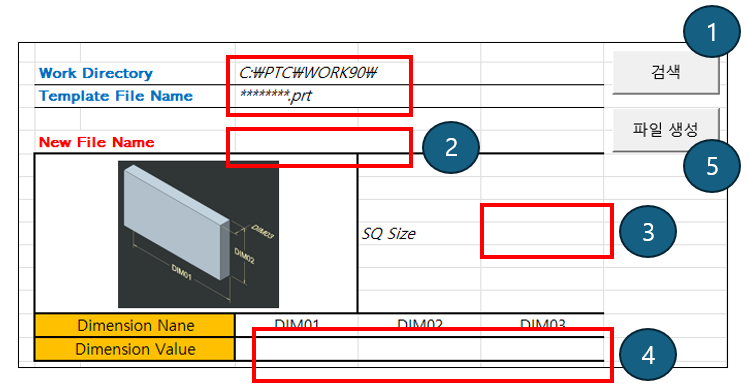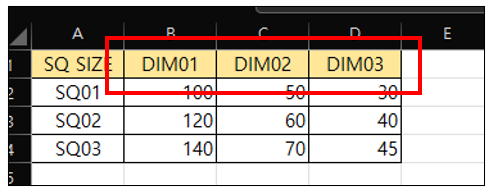 치수 값은 데이터 Sheet에서 선택하여 변경 가능 합니다. SQ Size를 선택 하면, DIM01, DIM02, DIM03 치수 값을 모델에 입력 할 수 있습니다. SQ Size는 추가 할수 있습니다. 주의 하실점은 치수 값은 아래 방향으로 증대 합니다.