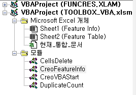 1. CreoVBAStart : 현재 활성화된 모델과 연결 합니다 2. CreoFeatureInfo : "CreoVBAStart"를 호출 합니다. Feature Type을 표시 합니다 "DuplicateCount"를 호출 합니다 3. DuplicateCount : 중복 Feature Type을 카우트 합니다 4. CellsDelete : 엑셀의 값을 모두 제거 합니다 |