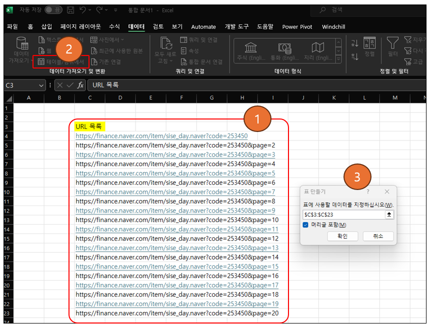 페이지 주소를 목록으로 만들고 데이터 테이블 만들기
