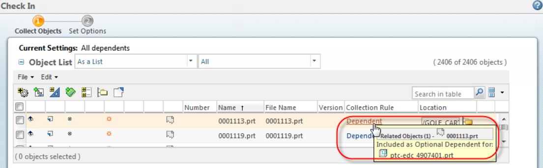 불완전한 객체(고스트 파일)에는 필수 및 선택 의 두 가지 유형이 있습니다. 이것은 체크인 대화 상자에서 불완전 객체에 대한 컬렉션 규칙 위에 마우스를 올리면 "필수 종속 항목" 인지 "선택 종속 항목" 인지 표시됩니다 .