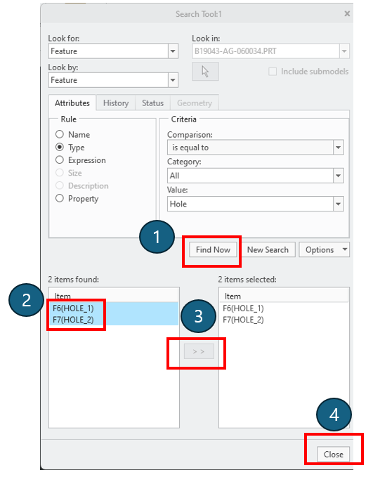 아래 그림과 같이 선택하고, "Find Now"를 클릭합니다. 모델에서 모든 Hole Feature만 선택 됩니다