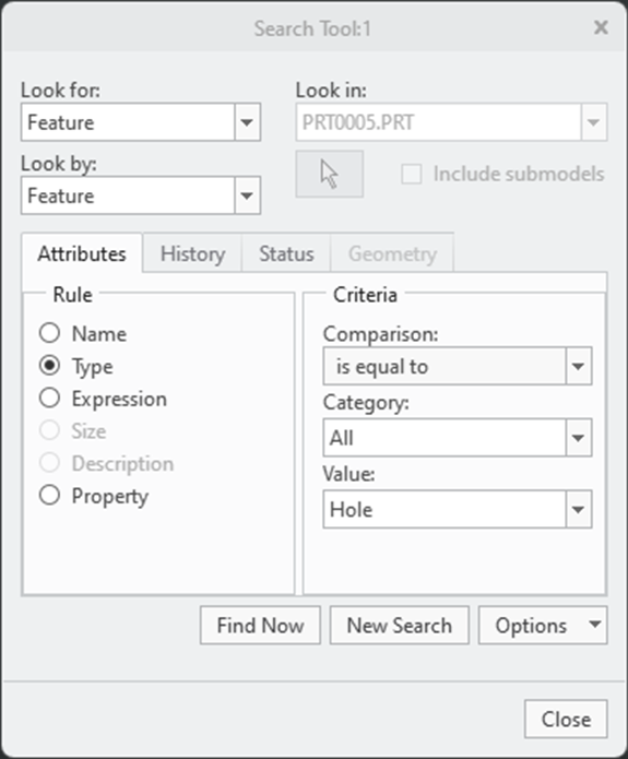 검색 도구를 사용하면 그래픽 창이나 모델 트리에서 선택하지 않고도 모델 내에서 엔티티를 찾을 수 있습니다. 특정 정보를 찾는 데 도움이 되도록 속성 (Attributes) , 내역( History ) , 상태(Status) 및 형상(Geometry) 탭을 사용하여 규칙을 지정할 수 있습니다 . 발견된 항목의 레이어를 생성하거나 발견된 항목을 검색 도구의 활성 선택 섹션으로 전송하여 전체 또는 하위 집합을 선택할 수 있습니다.