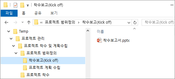 제품설계 (프로젝트)를 하면 다양한 문서와 CAD 파일을 만들고, 데이터를 수집 합니다. 이것은 다양한 폴더를 만들고 관리 합니다. "프로젝트" 단위로 폴더를 만들고, 폴더는 프로잭트 순서(프로세스)로 폴더들을 적성 합니다. 생성된 문서는 해당 폴더에 저장 합니다.