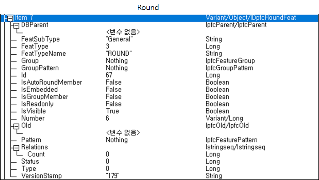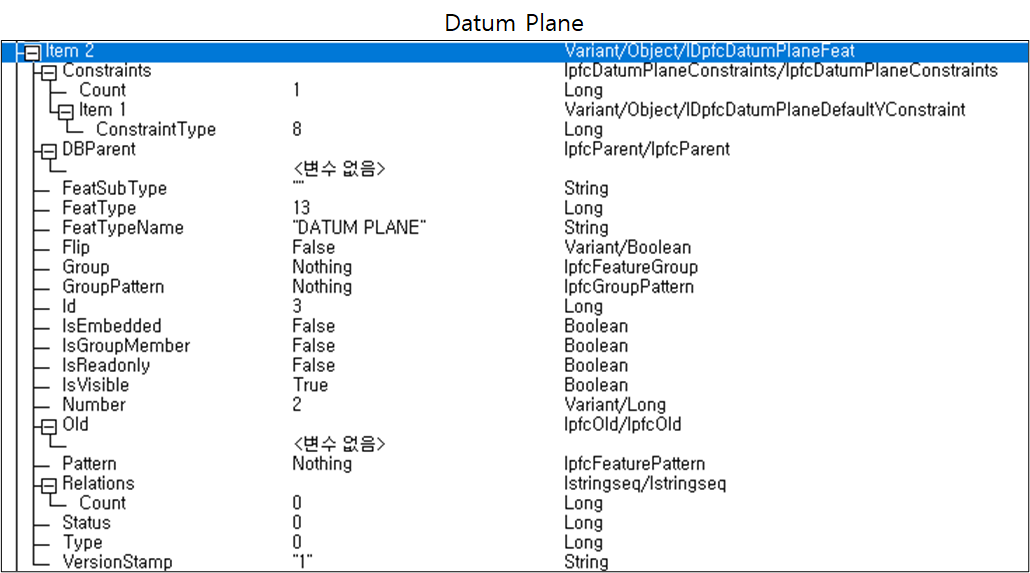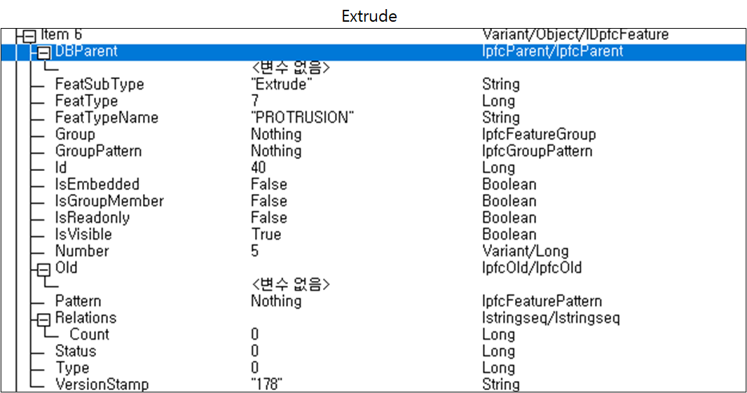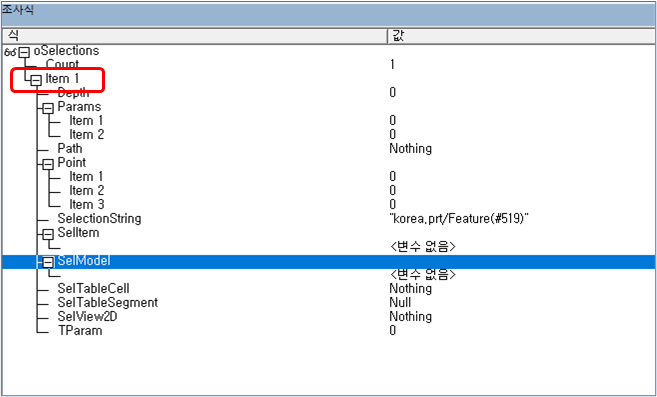 Creo 화면에서 선택된 Feature는 아래와 같은 리스트를 가집니다. "ITEM1"이 KEY 입니다.