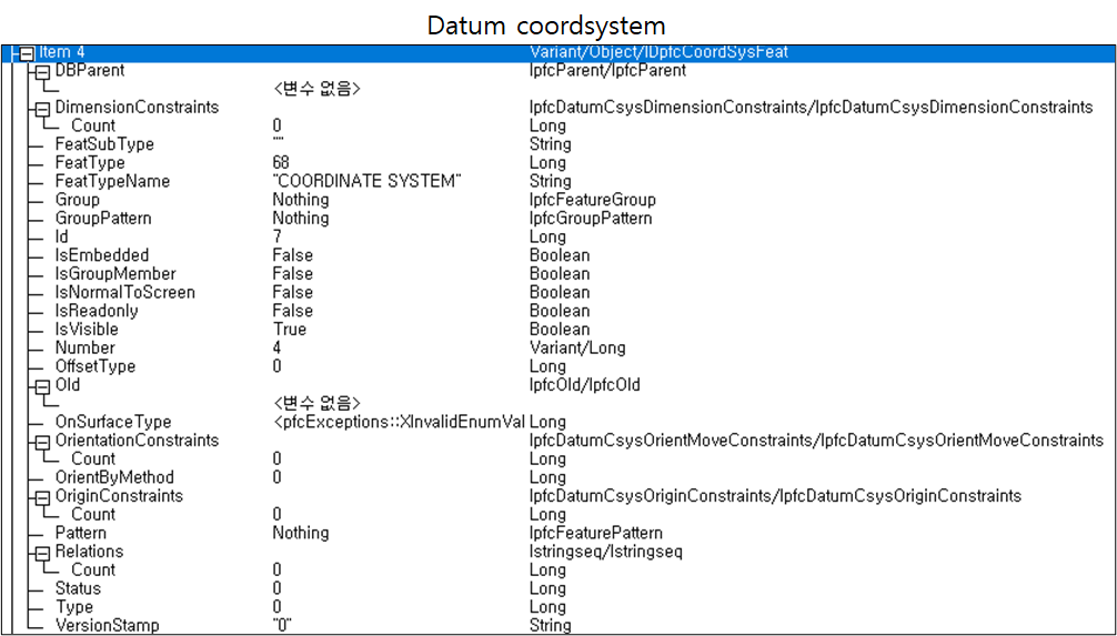 Set oFeatures = oSolid.ListFeaturesByType(False, EpfcFeatureType_nil)는 모델에서 모든 Feature들을 가지고온다