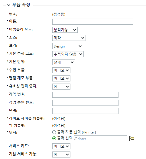 부품에는 이름, 번호, 버전이 있습니다. 또한 기본 측정 단위, 수명 주기 상태, 작업 상태, 소스와 같은 다른 설명적 속성도 포함됩니다.
