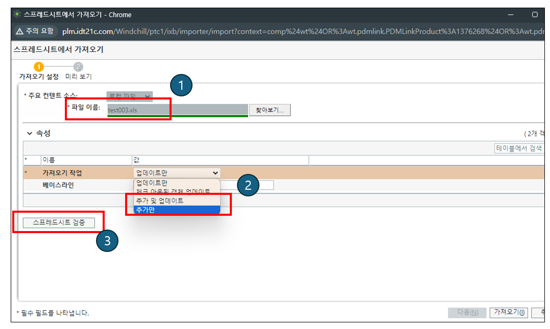 - 편집된 엑셀 파일을 선택 합니다. WTpart 체크인 조건을 선택 합니다. 정상적으로 동작 하는지 검증을 합니다.