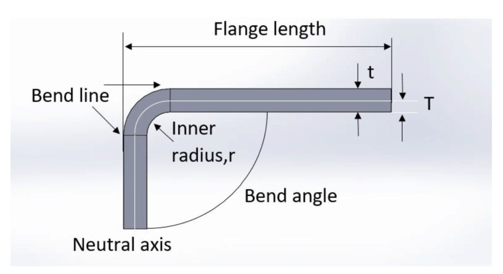- Bend angle – 굽힘 플랜지와 원래 위치 사이에서 측정한 굽힘 각도 또는 굽힘 선에서 그린 수직선 사이의 포함각. 때로는 내부 굽힘 반경으로 지정됩니다. 외부 굽힘 반경은 내부 굽힘 반경과 시트 두께를 더한 것과 같습니다.