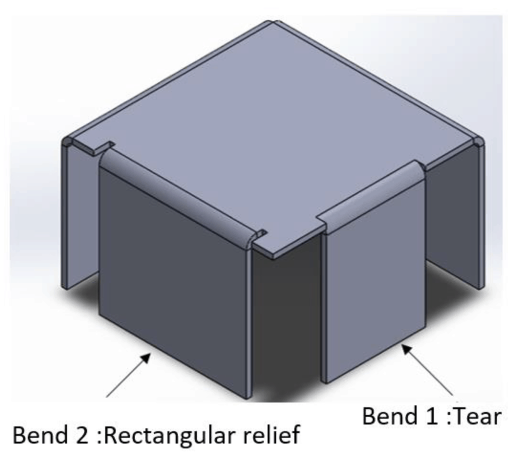 벤드 릴리프 확장은 굽힘이 모서리에서 확장되는 곳에 활용됩니다. 릴리프 노치는 찢어짐을 방지하기 위해 추가됩니다.