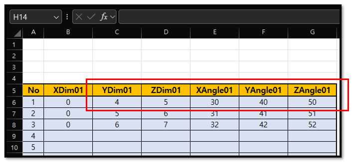 엑셀에 입력된 "6C:6G"까지의 값을 가져와서 모델의 치수를 변경 하는 코드 입니다.