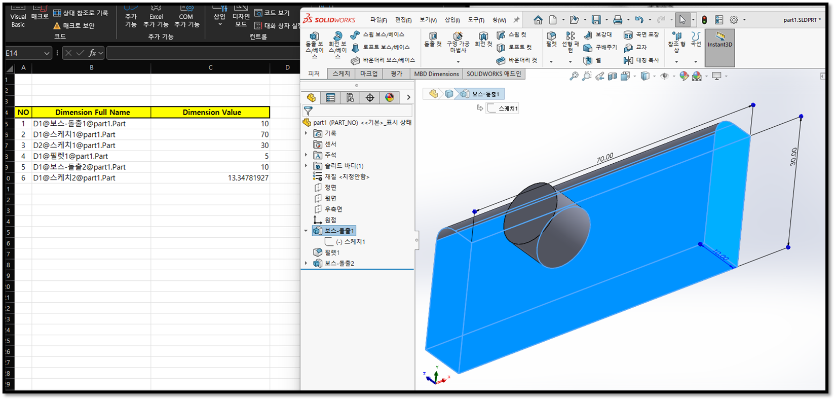 SolidWorks에서 치수 이름은 "치수ID@스케치명(ProfileFeature)" 또는 "치수ID@피처명(Extrusion,Fillet . .. )" 형식으로 되어 있습니다.