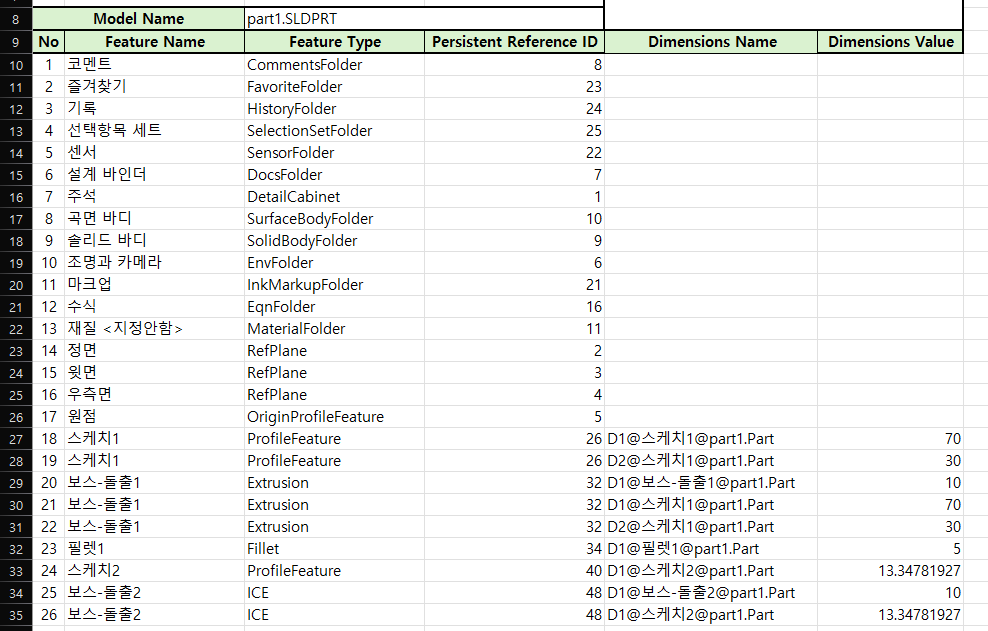 ' Feature의 치수값 가져오기