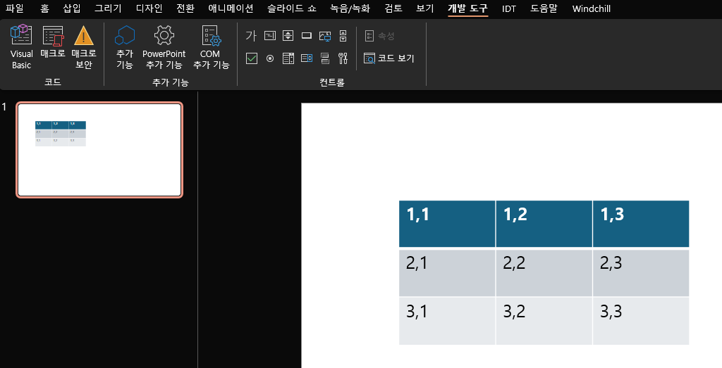 Debug.Print "슬라이드 " & sld.SlideIndex & "에서 테이블 '" & tblName & "' 찾음:"