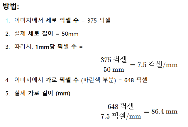 세로 값과 세로 방향의 픽셀을 이용히여 하늘색의 가로 방향 픽셀값을 이용하여 자동으로 가로 치수 계산을 요청 했지만, 정확한 값을 얻지 못했습니다.