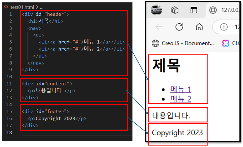- 영역 분할: <div>는 웹 페이지를 여러 개의 논리적인 영역으로 나눌 수 있습니다. 이를 통해 복잡한 레이아웃을 구성하거나 특정 콘텐츠를 그룹화할 수 있습니다.