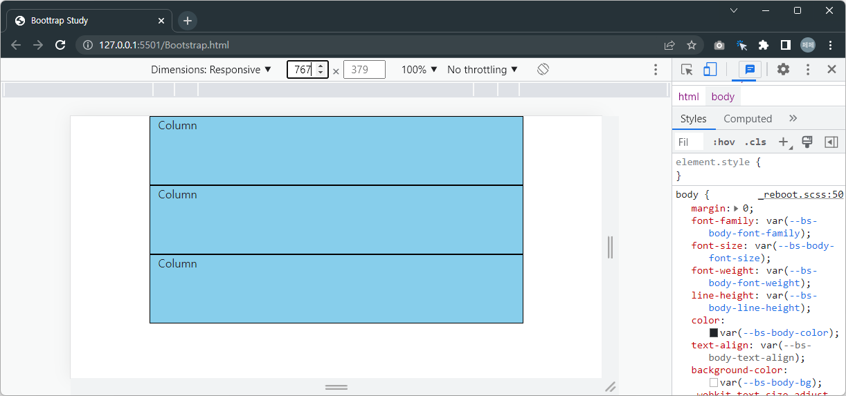 - .container-fluid: 화면 전체 너비를 사용하는 컨테이너로, 화면 크기에 관계없이 항상 꽉 찬 형태로 표시됩니다.