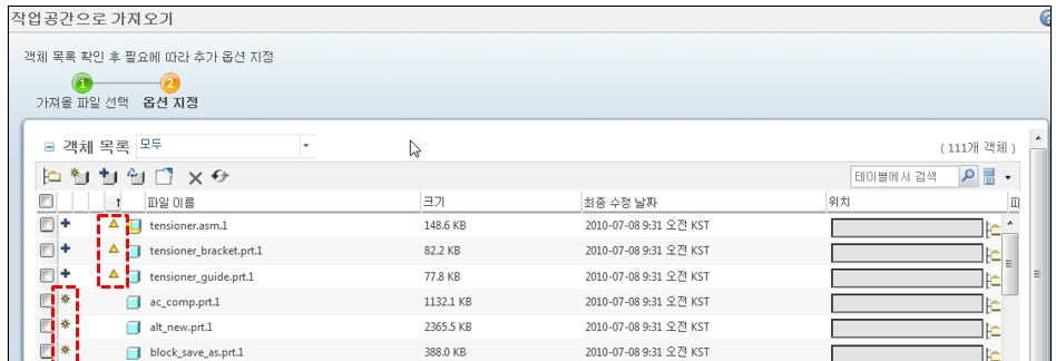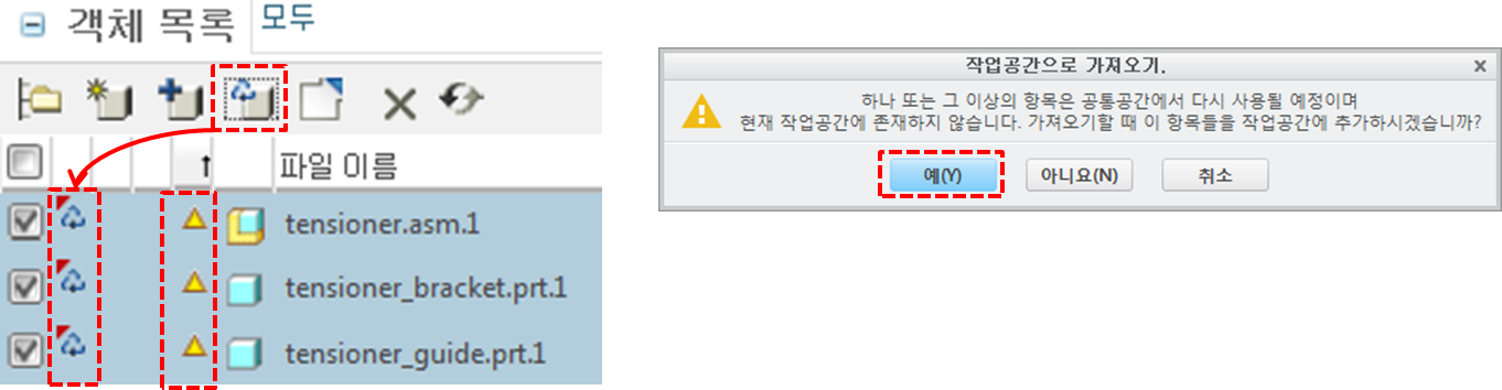 로컬 PC에 있는 Creo 파일을 체크인 하려면, 반드시 작업공간으로 가져오기 기능을 사용 합니다. 파일 이름이 동일한 경우, 서버의 동일한 이름의 파일을 사용할지, 아니면 작업공간으로 가져오기 파일을 상위 버전으로 사용 할지 결정할 수 있습니다 . 일부 파일의 경우 Ghost 파일이 발생하며 적절한 방법으로 해결 합니다. 주로 Creo의 참조관계에서 발생하므로, Creo로 파일을 열어서 관련 참조를 끊어주거나 재정의해 줍니다.