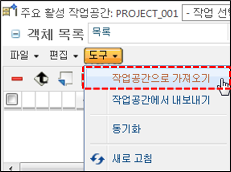 - 작업공간 툴바 또는 컨텍스트 메뉴에서 [작업공간으로 가져오기] 메뉴를 선택합니다.
