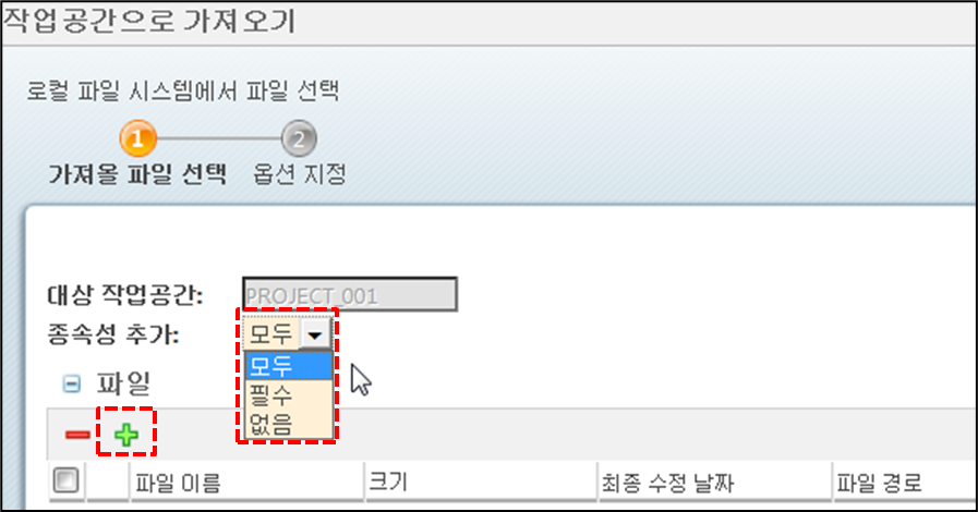 | 파일을 선택하여, 작업공간으로 파일 추가. 로컬 파일 시스템에서 가져올 객체로 이동. |