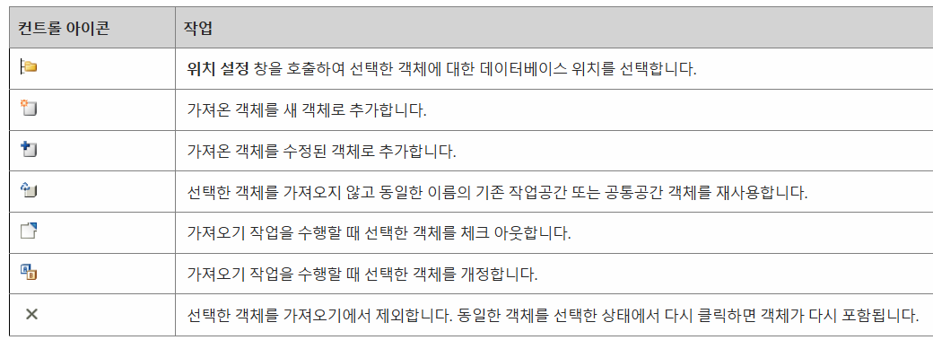 누락이나 그룹 이름 불일치 등이 원인일 수 있습니다 - 상태 검증: 가져온 객체의 상태(예: "새로 생성", "기존 객체 재사용", "수정됨")를 작업공간의 상태 열에서 확인하여