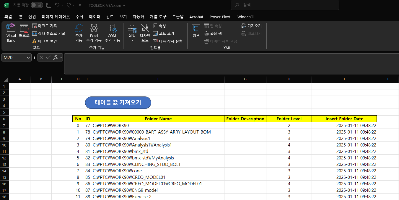 데이터 베이스의 테이블에 저장된 값들을 엑셀로 가져오는 코드 입니다. 엑셀의 기능으로 데이터를 가공하여 다양한 정보를 얻을수 있습니다. 아래 예제는 특정 폴더(C:\PTC\WORK90) 하위에 있는 폴더 이름과 레벨을 표시한것 입니다. 또한 테이블에 입력한 날짜를 가져오도록 하였습니다.