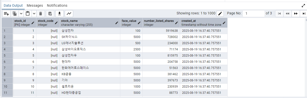- 테이블 초기화: recreate_database_table 함수를 통해 기존 stock_name 테이블을 완전히 삭제하고, 필요한 컬럼들(stock_id, stock_name, face_value, number_listed_shares, created_at)을 포함한 새로운 테이블을 깨끗하게 다시 생성합니다. 이는 데이터베이스 구조 관련 오류를 해결하는 데 유용합니다.