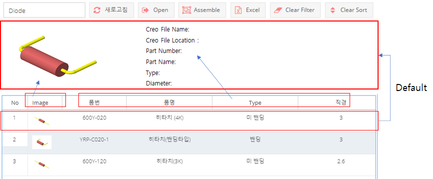 * 이미지 변환 기능은 CREO Session에 Open 함으로, Creo Model의 Parameter를 Creo 파일명을 key 값으로 데이터
