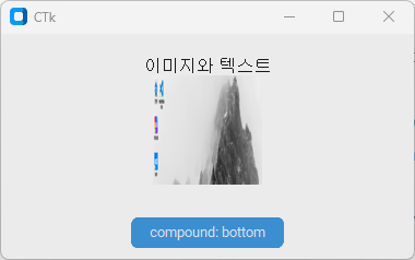CustomTkinter에서 CTkLabel 위젯의 compound 속성을 사용하여 텍스트와 이미지를 다양한 배치 방식("top", "bottom", "left", "right")으로 표시하는 예제 코드입니다.