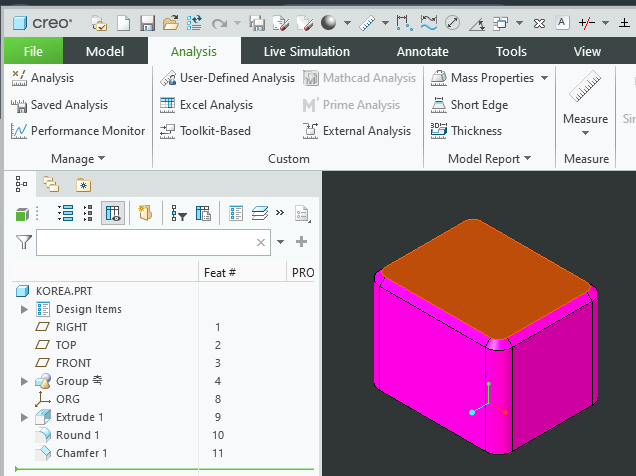 | List the model's features: Feature Name: RIGHT, Type: DATUM PLANE, ID: 1 Feature Name: TOP, Type: DATUM PLANE, ID: 3 Feature Name: FRONT, Type: DATUM PLANE, ID: 5 Feature Name: 축, Type: GROUP HEAD, ID: 19185 Feature Name: X, Type: DATUM AXIS, ID: 46 Feature Name: Y, Type: DATUM AXIS, ID: 39 Feature Name: Z, Type: DATUM AXIS, ID: 50 Feature Name: ORG, Type: COORDINATE SYSTEM, ID: 7 Feature Name: , Type: PROTRUSION, ID: 19417 Feature Name: , Type: ROUND, ID: 19440 Feature Name: , Type: CHAMFER, ID: 19536 |