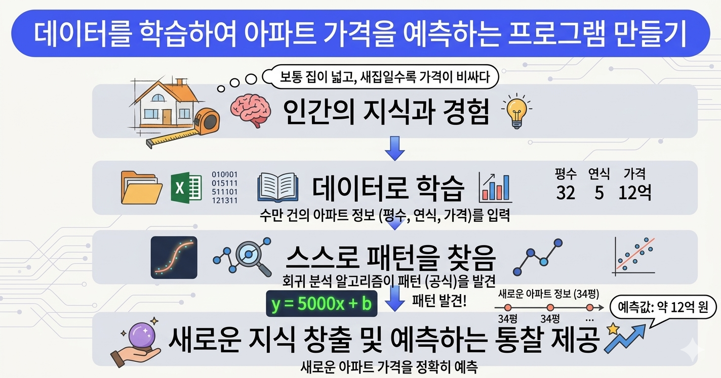 회귀 분석 알고리즘이 데이터를 훑으며 "평수가 1평 늘어날 때마다 가격은 평균 5,000만 원씩 오르는구나"라는 수학적 공식($y = ax + b$)을 찾아냅니다. 이것이 바로 '패턴'입니다.