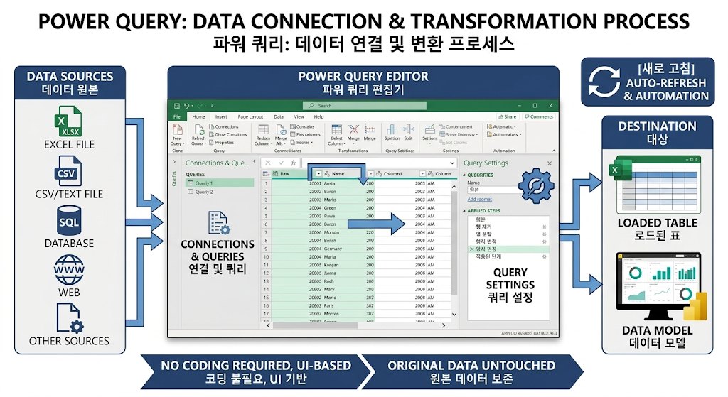 - 자동화: 데이터 가공 과정을 단계별로 기록하여, 원본 데이터만 바뀌면 '새로 고침'으로 자동 업데이트.