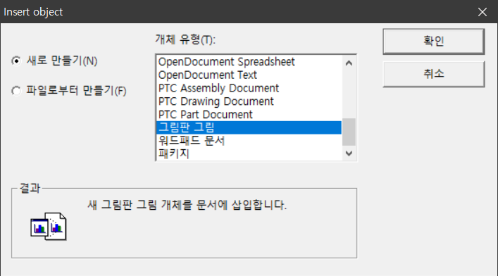 1. Insert > object 선택 > 새로만들기 > 개체유형 > 그림판 그림 > 확인