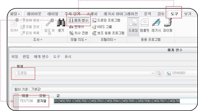 스트링 타입의 매개변수는 70개 문자로 구성 가능 합니다. Croe Drawing 모드의 시스템 Parameter는 다음과 같습니다,