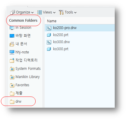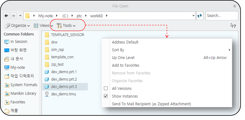 All Versions를 선택 하면 Creo Parametric에서는 최근에 저장된 버전의 객체를 자동으로 읽어들이지만, 확장자와 버전 번호를 포함한 전체 파일 이름(예: bracket.prt.5)을 입력하여 이전 버전을 읽어들일 수 있습니다.