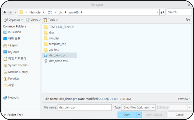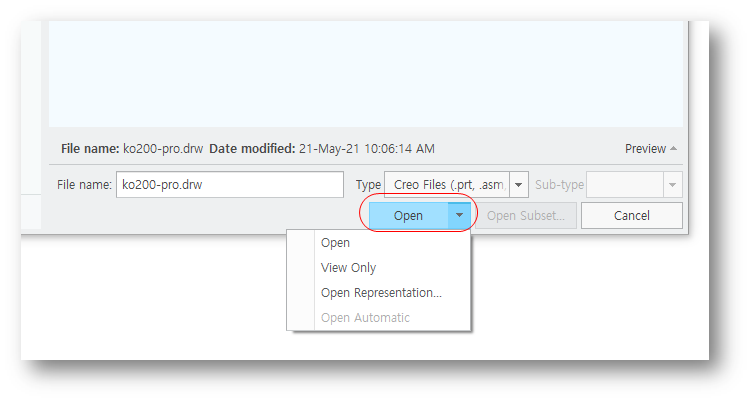 4. 단순화 표현을 선택 하여 Creo 파일을 open 할수 있습니다.
