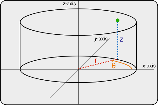 2. 원통(Cylindrical) - 반지름, 세타 및 Z 좌표를 사용하여 참조된 좌표계를 기준으로 위치를 설정합니다.