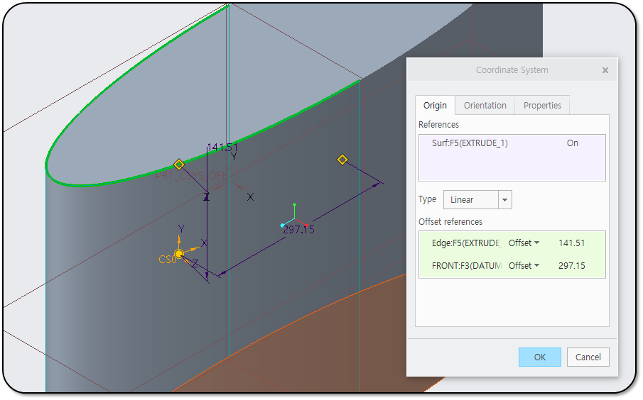 좌표계는 "서피스 상 좌표계"와 "오프셋 좌표계"의 두 종류가 있습니다. 좌표 계는 3D 공간에 Point를 만들고, X,Y,Z 방향을 정의 합니다. 또한 스케치된 좌표계 생성을 할 수 있습니다.